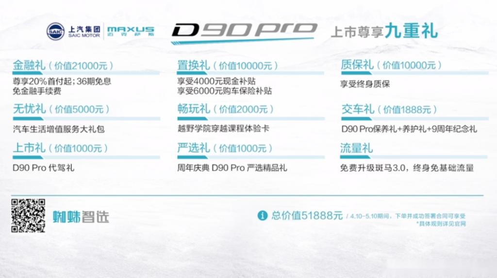 4月10日,上汽MAXUSD90Pro正式上市,新车共推出七款车型,价格区间为17.98-27.98万元,新车根据现款D90晋级而来,选用承载式硬派车身规划,作为一款专业级SUV,D90Pro全系搭载2.0T双增压柴油发动机/2.0TGI和采埃孚8速手自一体变速箱,上市之际为还顾客特别供给了九重尊享大礼。