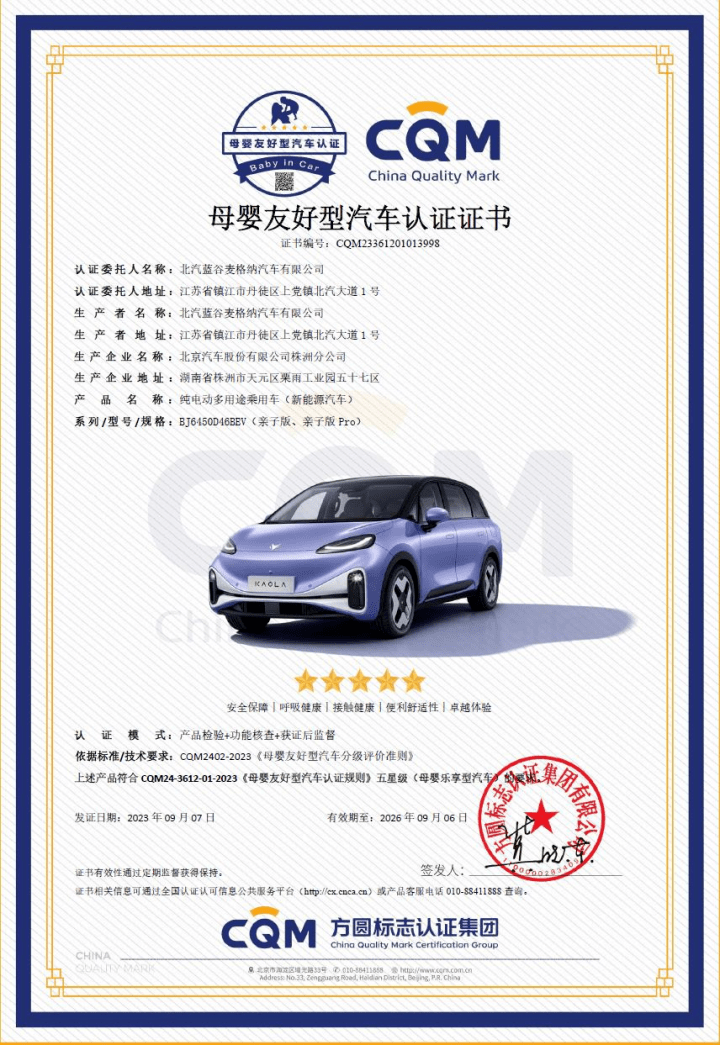 为了保证孩子在最好的环境里成长,极狐汽车考拉首创出可以健康呼吸的“纯净儿童房”。以车内有害于人体健康的物质控制为例,极狐汽车考拉在国标限制 8 项物质基础上,新增了对早期儿童发育危害较大的 3 项物质的控制。采用吸附降解技术,在国标25℃常温测试下,上述11项物质有6 项呈零检出状态。基于这样的健康实力,极狐汽车考拉最近还获得了“母婴友好型汽车”五星权威认证,成为行业里首个获此殊荣的车型。
